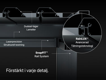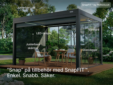 Med vårt SnapFIT™️-system kan du sömlöst lägga till tillbehör när som helst, så att du kan anpassa pergolan perfekt efter dina önskemål. -