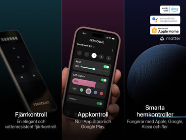 Styr din pergola enkelt via ditt smarta hem, appen eller fjärrkontrollen. Pergolan drivs av Next-Gen Matter®-teknik för sömlös integration med Google Home, Amazon Alexa och mer.