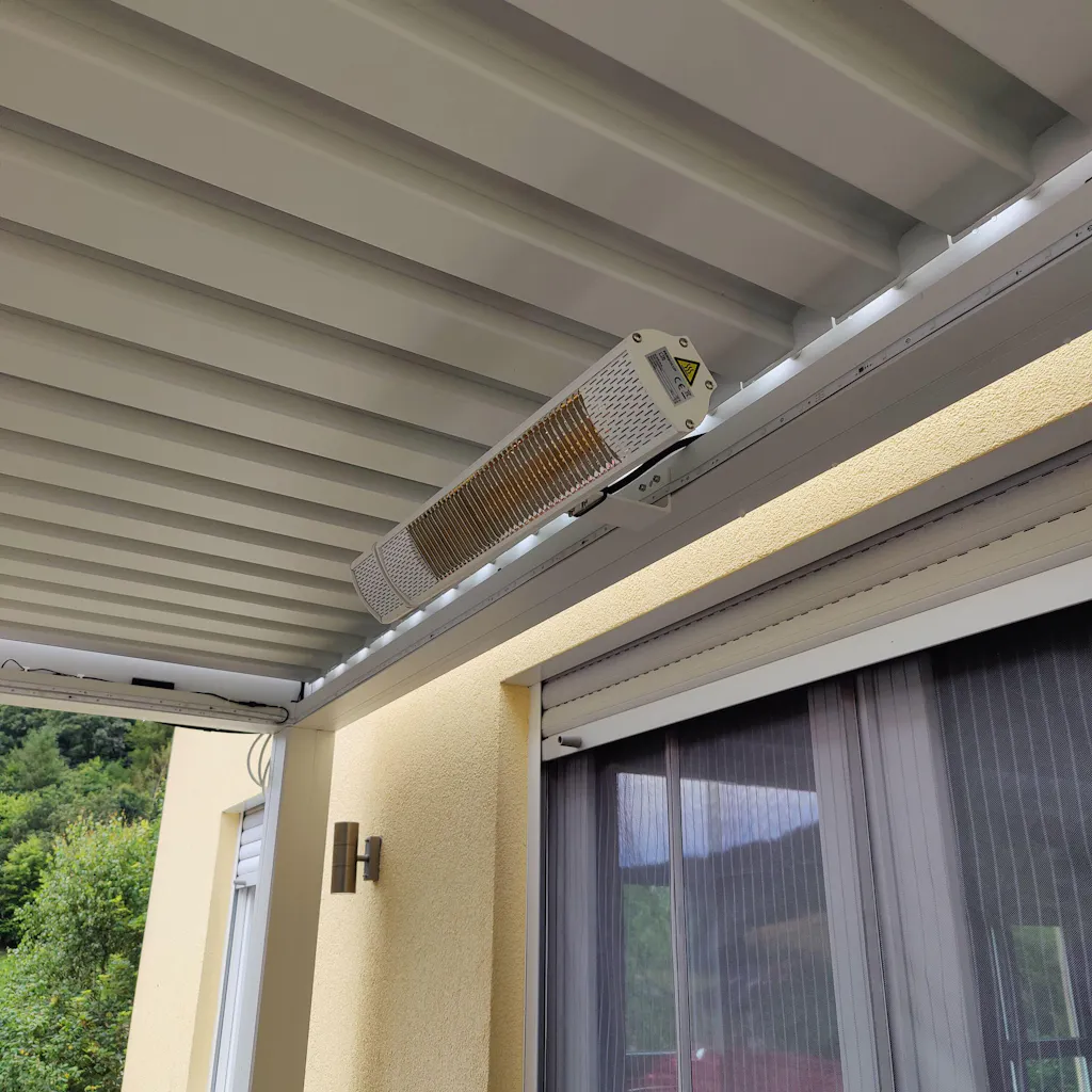 Tillgänglig i vitt och antracitgrått, smälter den perfekt in i din pergola och bibehåller ett stilrent, inbyggt utseende samtidigt som den ger mysig, omgivande värme för njutning året runt.