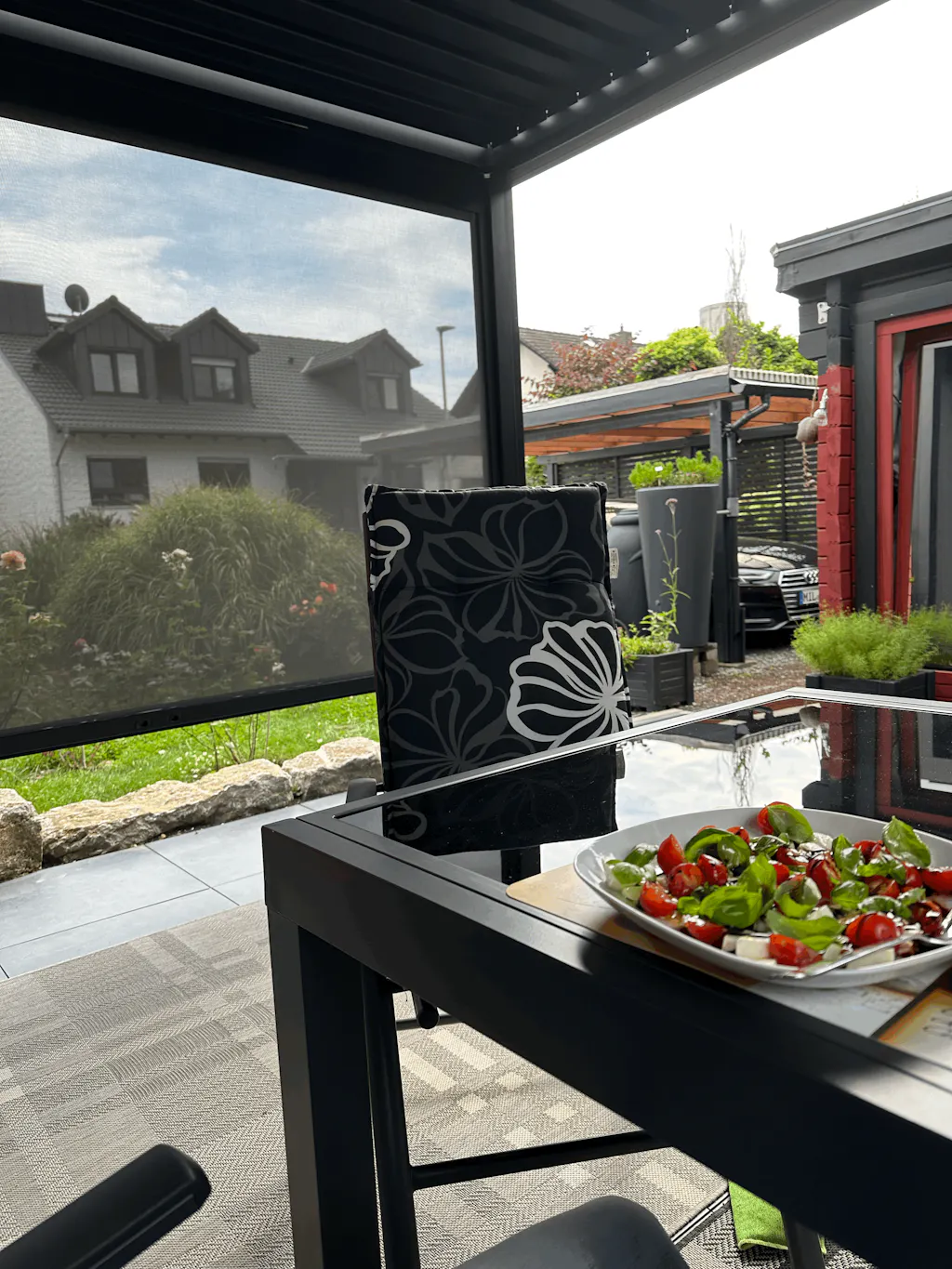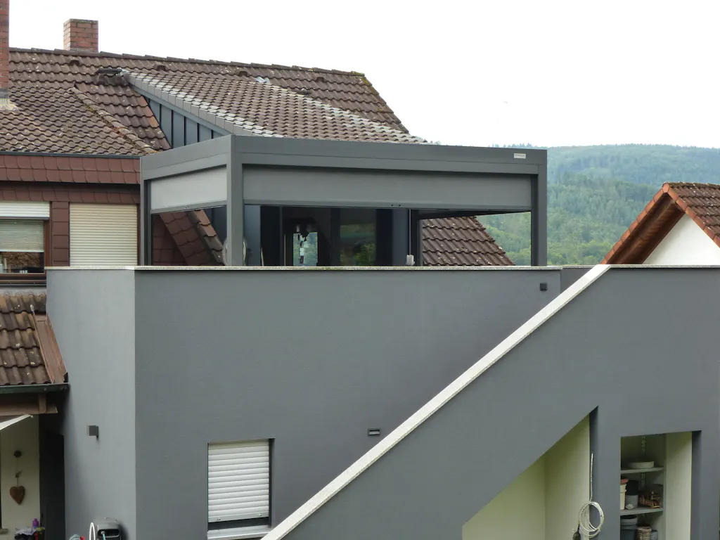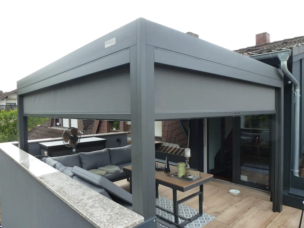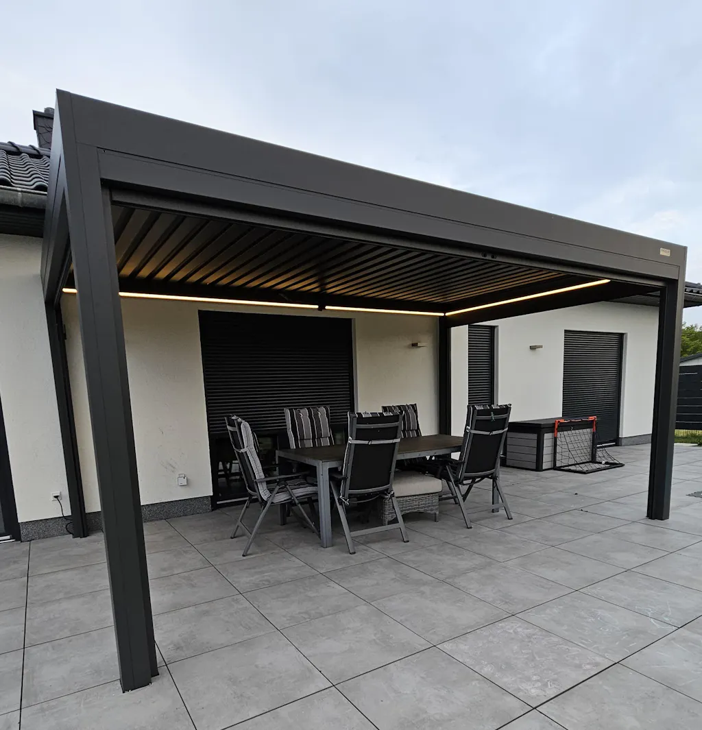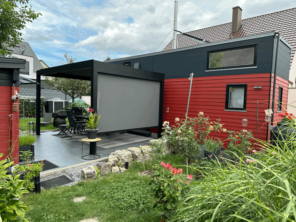 Jag bestÀllde en 3x4m Sundream S2 (vÀggmonterad) med RGB-belysning och skÀrmar. Varför en pergola och inte ett glastak? Jag ville ha möjligheten att öppna taket, och ett glastak krÀver ocksÄ extra skuggning. Jag valde vita lameller sÄ att under den "mörka" sÀsongen kan maximalt ljus fortfarande komma in nÀr lamellerna Àr öppna. SkÀrmarna Àr viktiga eftersom nÀr solen Àr lÄg kan det annars orsaka blÀndning, och man skulle behöva anvÀnda nÄgon form av solskydd igen. Jag Àr mycket nöjd med resultatet.